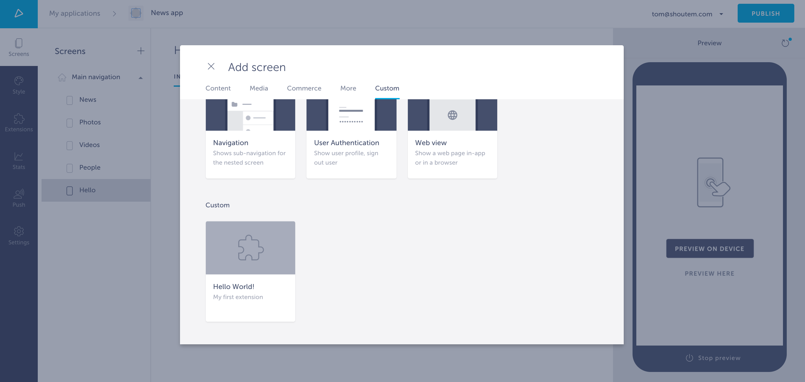 Shoutem apps are managed on a beautiful web interface called the Builder. This allows non-technical people to create apps from extensions built by Shoutem and the community, while also allowing developers to save time setting up a part of their app. If you haven’t already, go to the Builder and create an account. Once signed in, you can create an app from some template or just make blank app. Lets start with a News app template.
